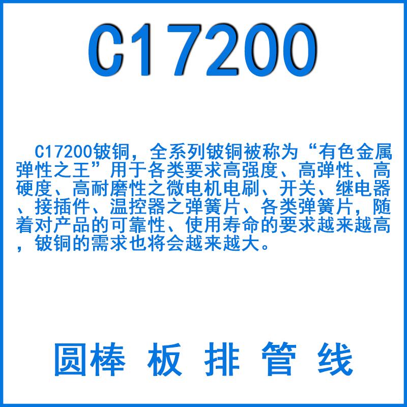 C17200鈹銅是進口鈹銅的一種。C17200鈹銅,全系列鈹銅被稱為“有色金屬彈性之王”用于各類要求高強度、高彈性、高硬度、高耐磨性之微電機電刷、開關、繼電器、接插件、溫控器之彈簧片、各類彈簧片,隨著對產品的可靠性、使用壽命的要求越來越高,鈹銅的需求也將會越來越大。