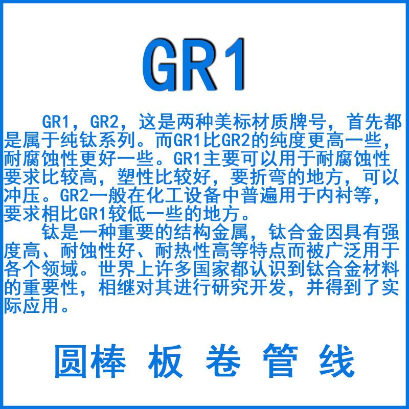 GR1,GR2,這是兩種美標材質牌號,首先都是屬于純鈦系列。而GR1比GR2的純度更高一些,耐腐蝕性更好一些。GR1主要可以用于耐腐蝕性要求比較高,塑性比較好,要折彎的地方,可以沖壓。GR2一般在化工設備中普遍用于內襯等,要求相比GR1較低一些的地方。