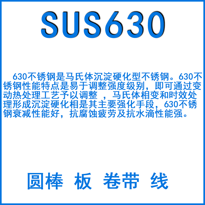 SUS630是馬氏體沉淀硬化不銹鋼,中國牌號0Cr17Ni4Cu4Nb。具有高強度,高硬度,較好的焊接性能和耐腐蝕性能。已經被大量的推廣運用在閥門,軸類及化纖行業及具有一定耐蝕要求的高強度零部件等。